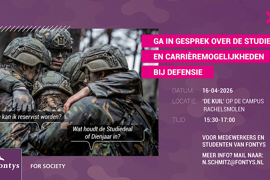 Ben je nieuwsgierig naar een studie, stage of loopbaan bij Defensie? Tijdens deze interactieve sessie op campus Rachelsmolen krijg je antwoord op al je vragen. Medewerkers van Defensie zijn aanwezig om je volledig bij te praten over opleidingen én carrièremogelijkheden.