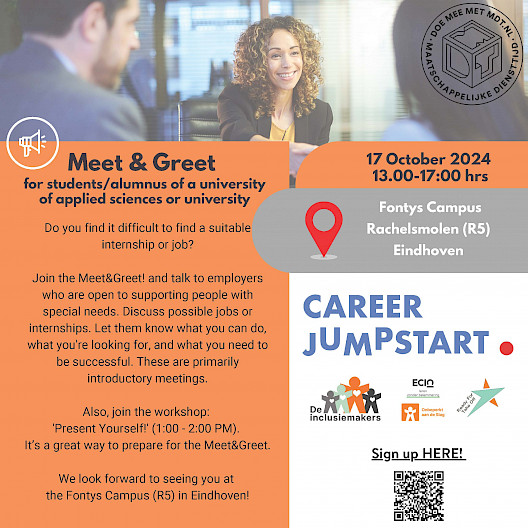 Meet employers who are open to anyone with a support question during the Meet & Greet. A Meet&Greet is a place where you can meet employers and talk to them about a possible job or internship. You can tell them what you can do, what you would like and what you need to be successful in your job.